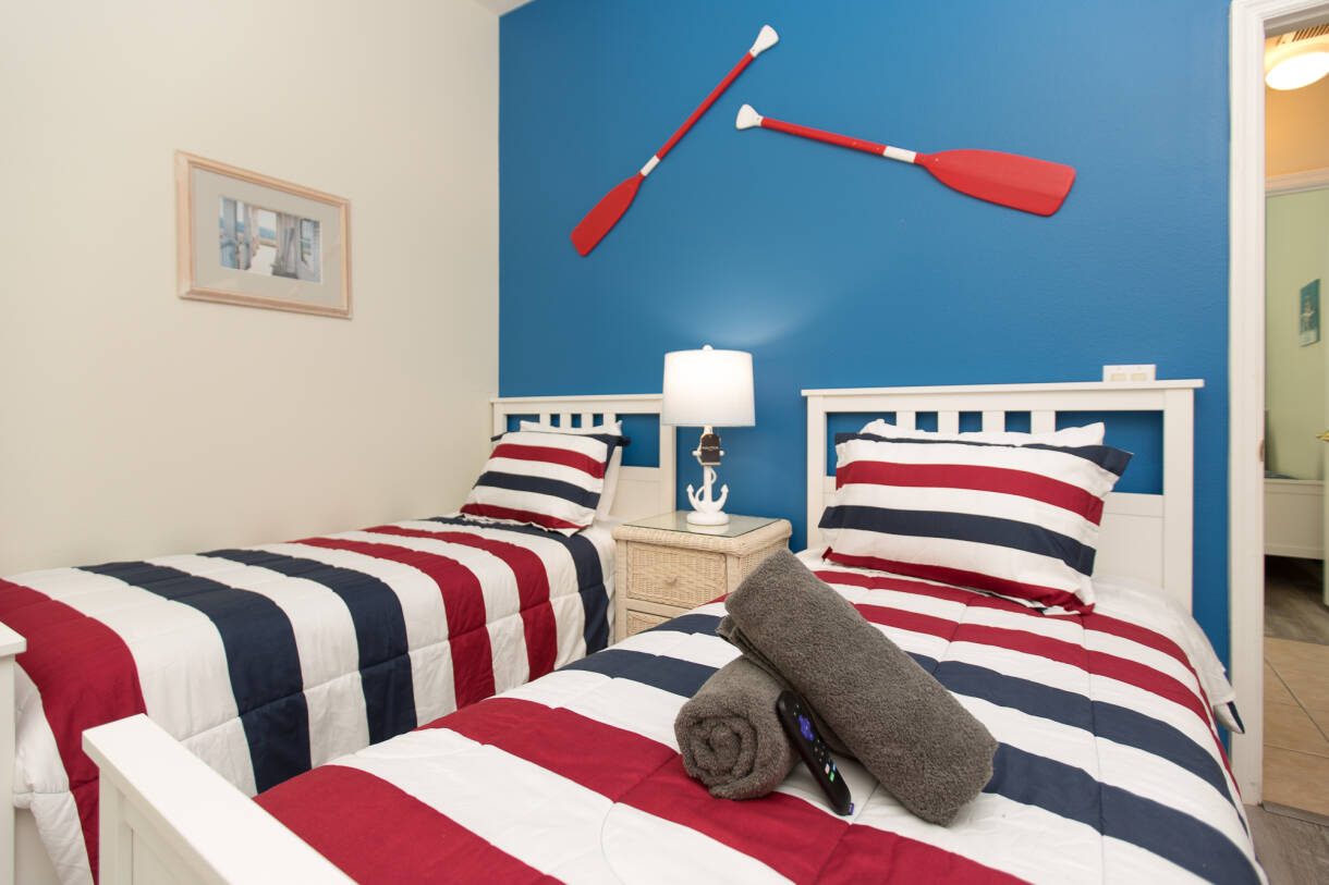The front bedroom has a queen bed, and the other two bedrooms have cool nautical vibes with two single beds each. They share a bathroom equipped with everything you need – sink, toilet, and a tub/shower combo.