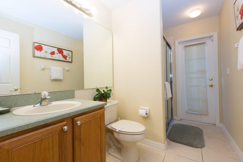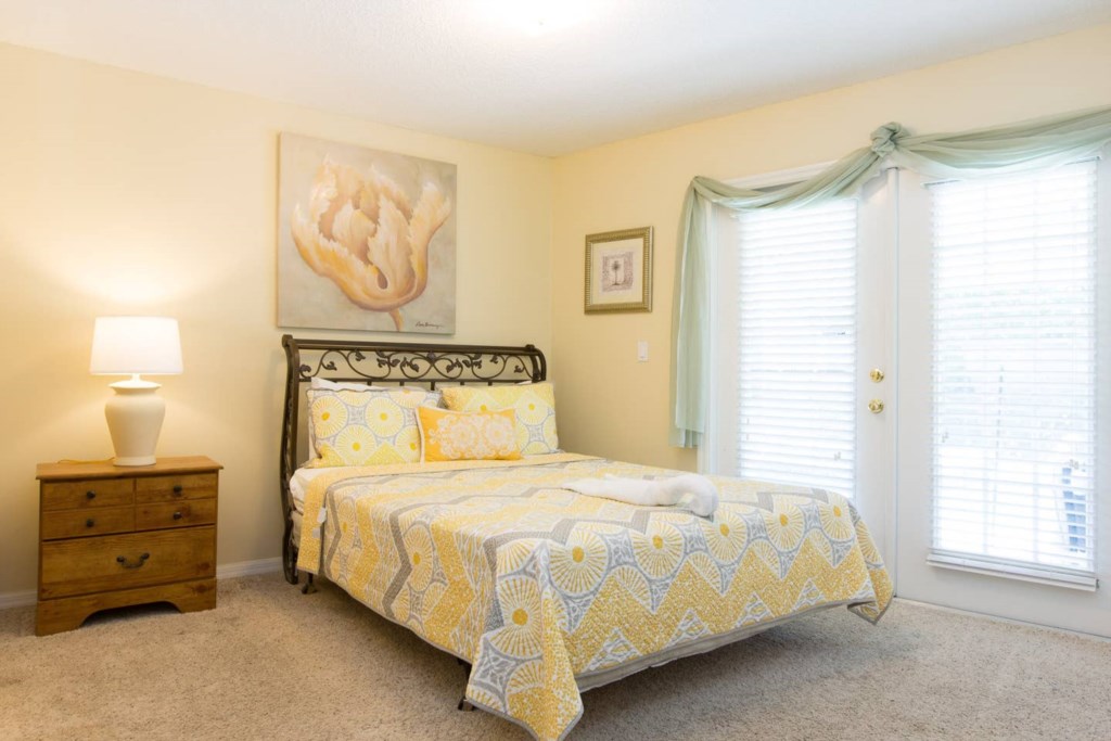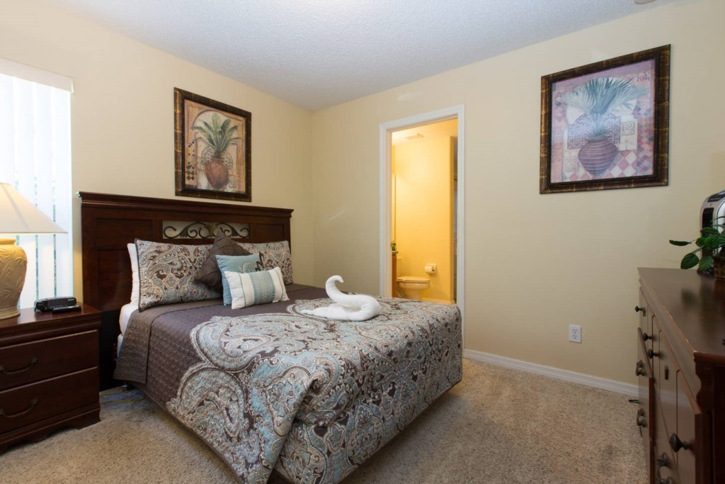 Bedroom 5: 1 Full bed with nightstands, dresser, closet, TV and ensuite bathroom with tub, separate shower, vanity, and toilet. The bedroom gives access to the pool deck.