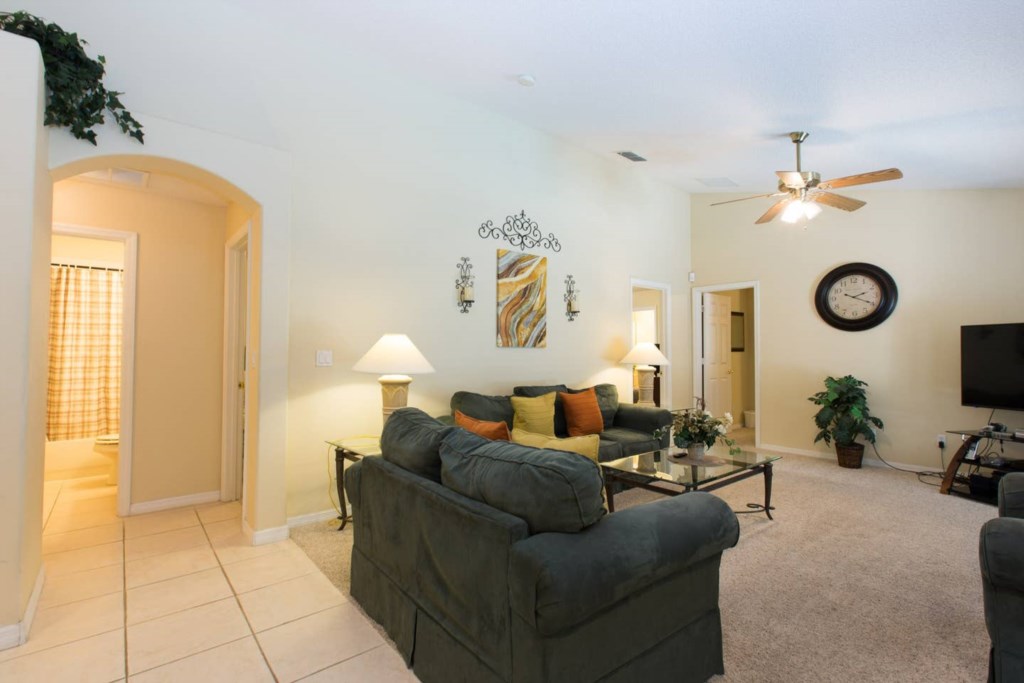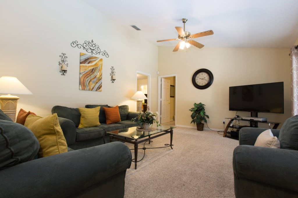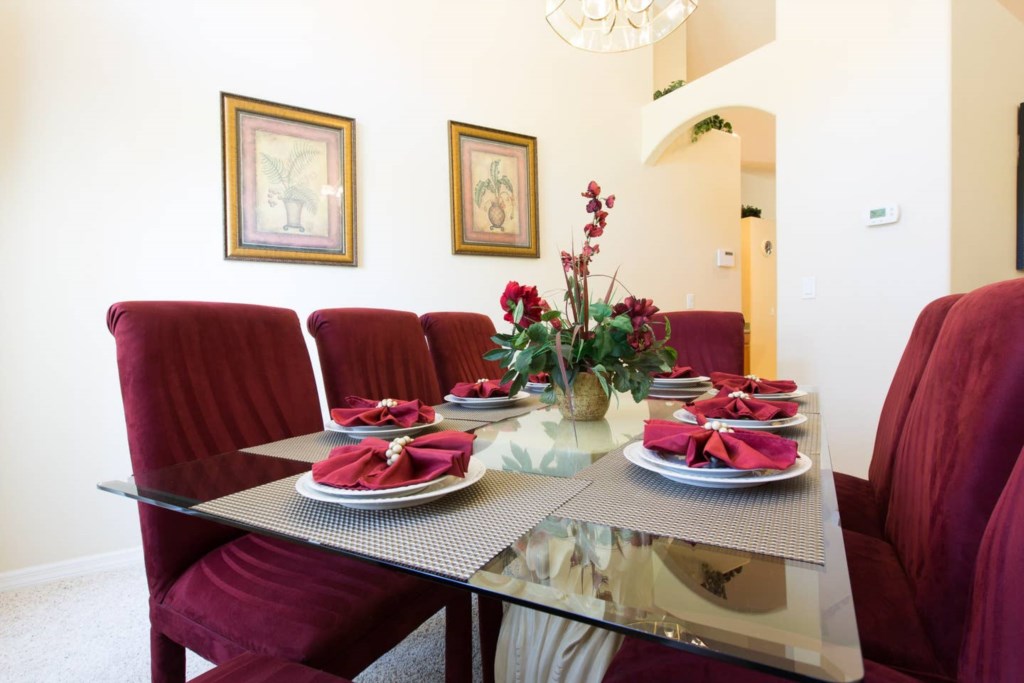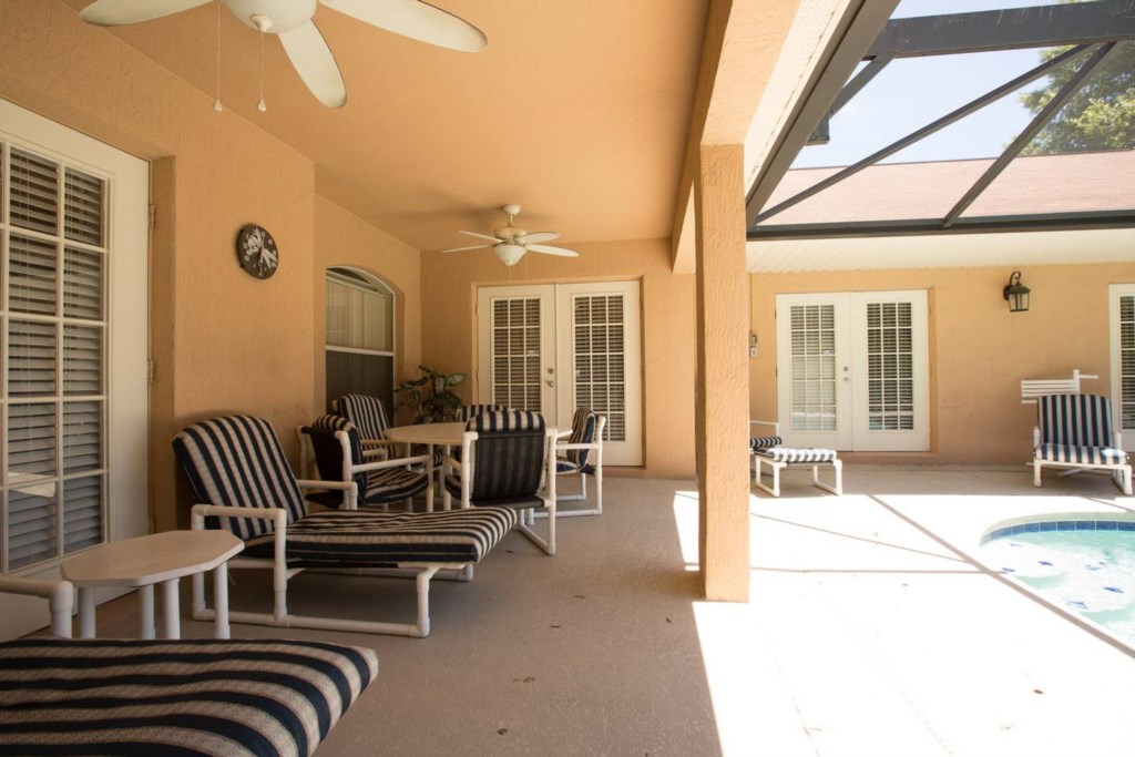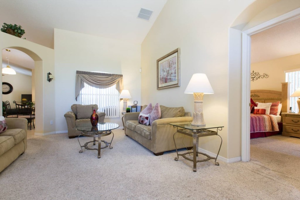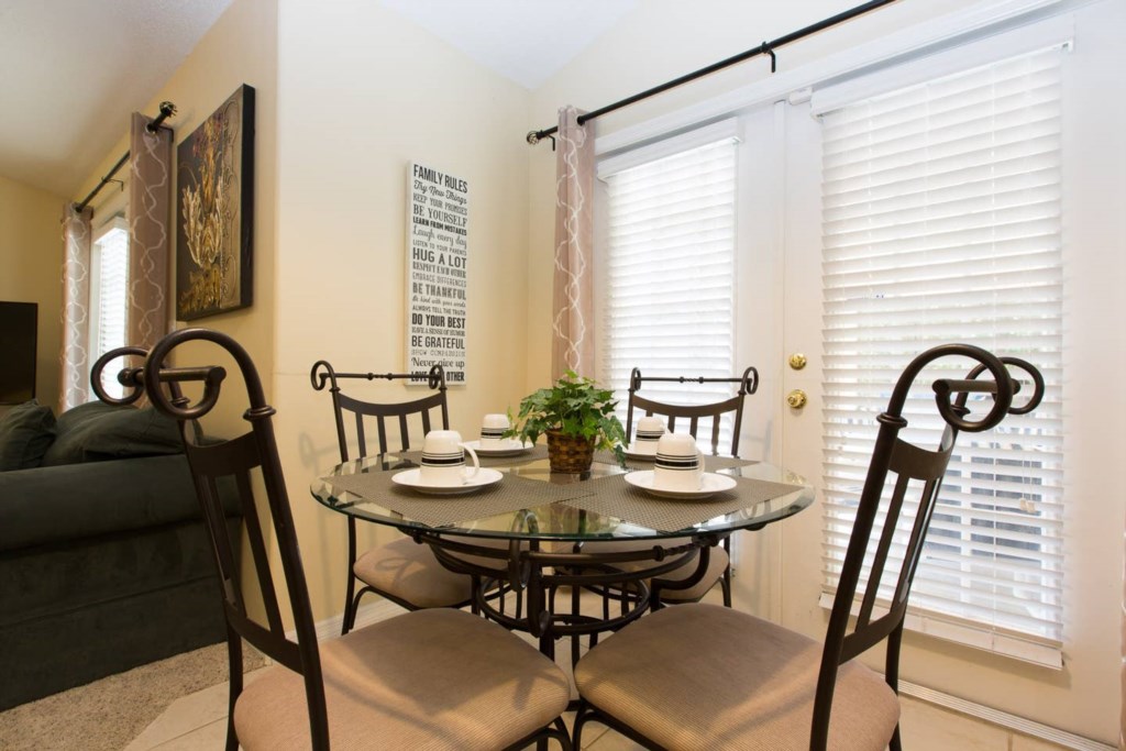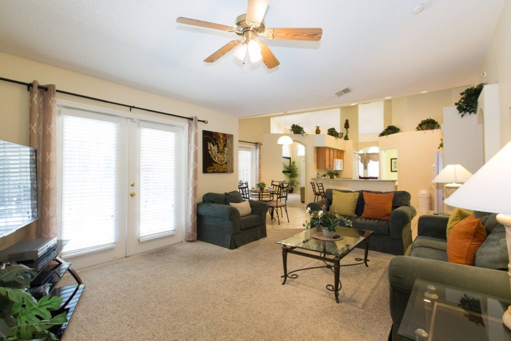 The spacious living room has plenty of seating, a breakfast area with 4 seats and gives access to the pool deck.