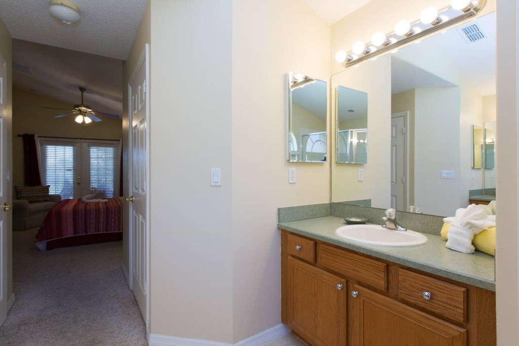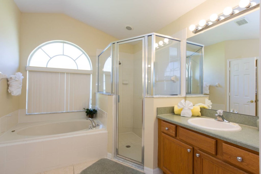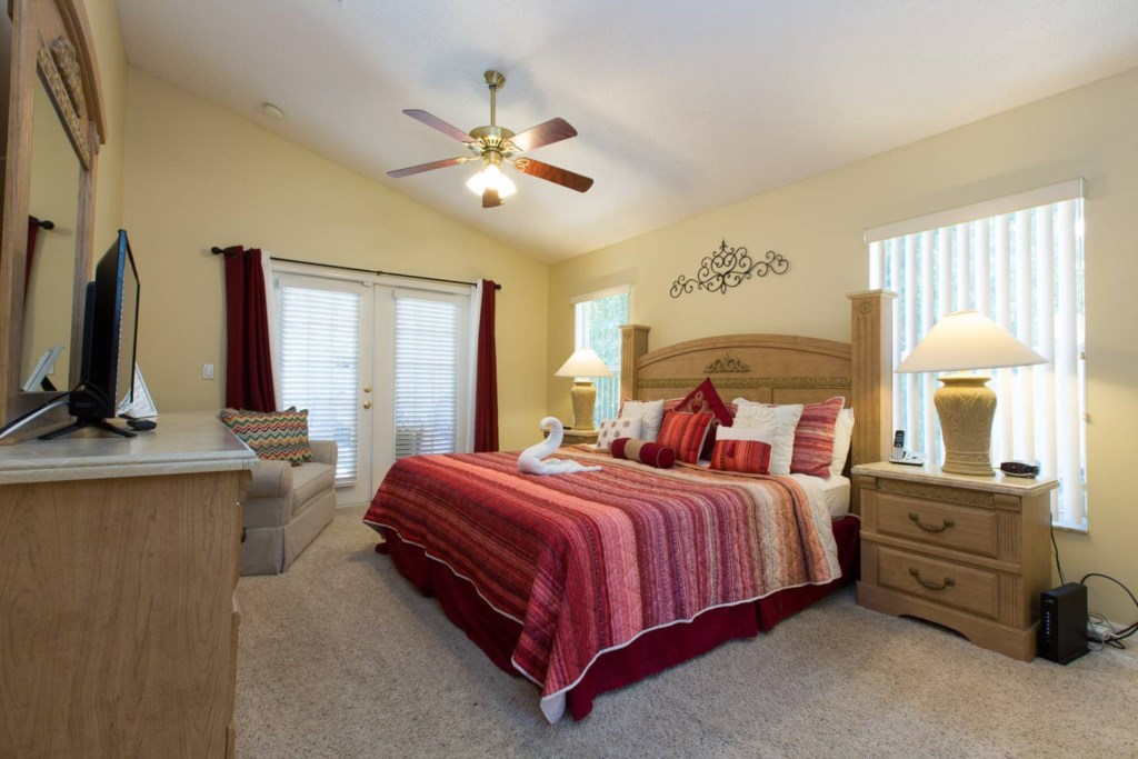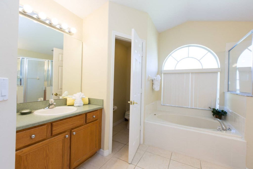It has 5 bedrooms: The master bedroom has a King size bed with nightstands, walk-in closet, dresser and flat screen TV, the spacious bathroom is en suite and has a shower, tub, two vanities and a separate toilet.
