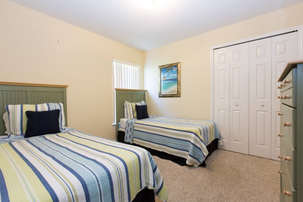 Bedroom 3: 2 Twin beds, nightstand. dresser, and closet.